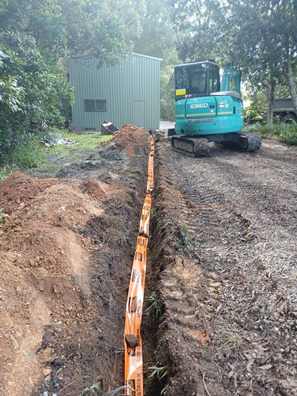 • Underground cable run — This is the most common and visually appealing option. Your electrician will install durable cable through orange conduit buried at least 500mm deep, or deeper in areas where heavy vehicles frequently pass. This method protects the cable from harsh weather, wildlife interference, and falling branches, making it the preferred choice for most properties with significant acreage.